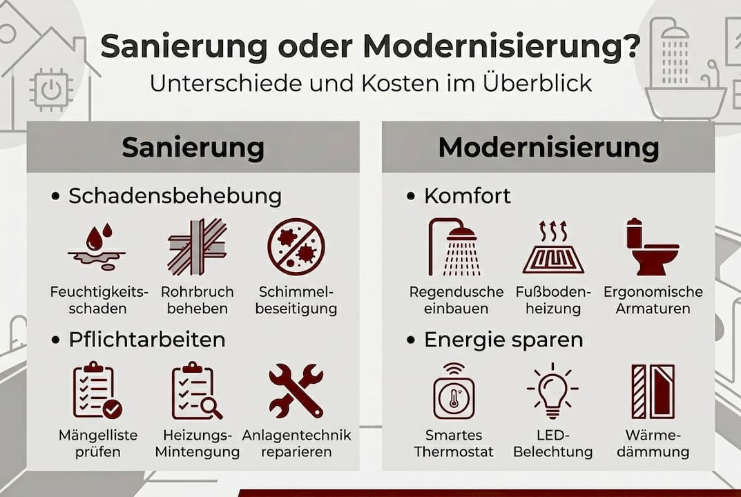 Wichtig: Nicht jeder Umbau ist automatisch eine Modernisierung. Wer nur Fliesen tauscht, weil die alten nicht mehr gefallen, renoviert. Eine Modernisierung liegt erst vor, wenn der Wohnstandard oder die Energieeffizienz objektiv steigt.