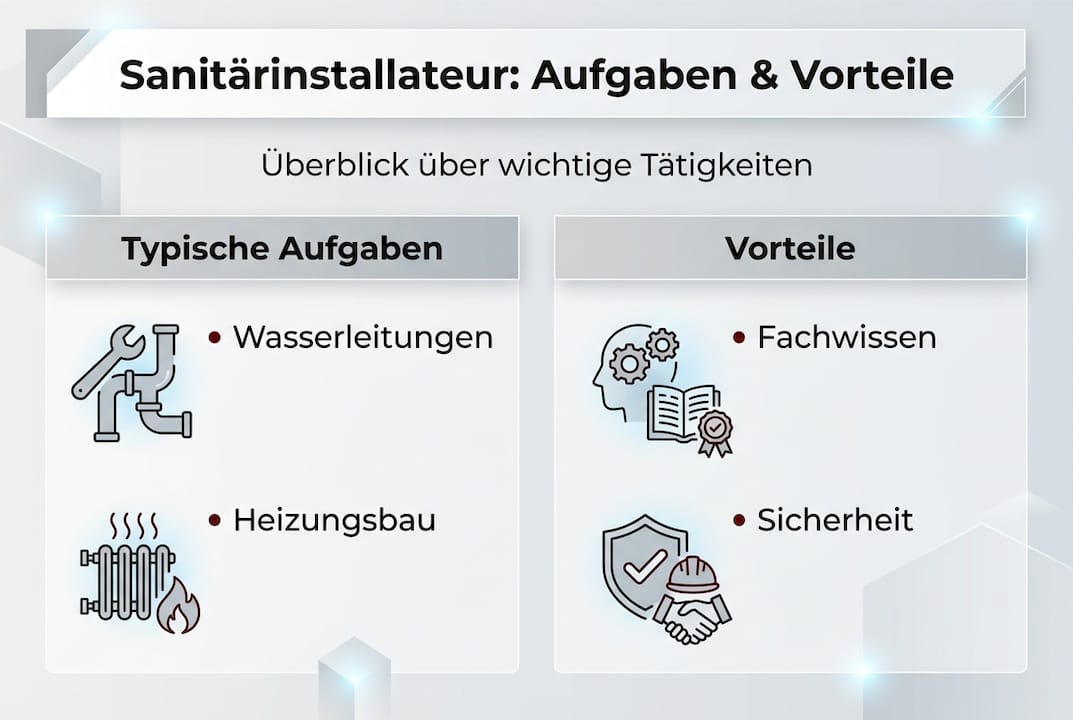 Bei Neuinstallationen, Umbauten und Notfällen ist ein Fachbetrieb unverzichtbar. Auch für regelmäßige Wartungen gilt: Notdienste und Wartung sind typische Aufgaben eines Sanitärinstallateurs.